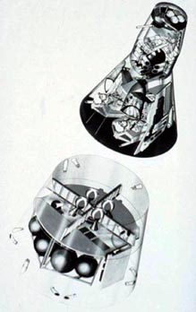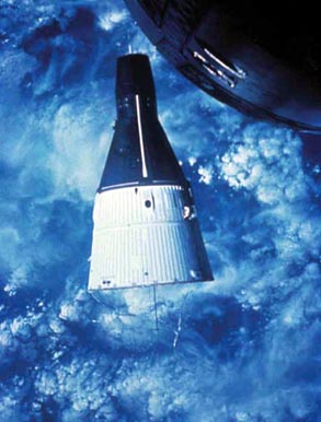 | 1. Canadian Jim Chamberlin played a major role in the final design of Mercury. This sketch of the Mercury spacecraft is the exact rendition of the one in which John Glenn orbited the earth on February 20, 1962 � just three years to the day after the Avro Arrow cancellation. [Photo, courtesy NASA via William Mellberg] 2. Jim Chamberlin received the NASA Gold Medal for his work on Gemini. Viewed here, astronauts Wally Schirra and Tom Stafford in Gemini 6 photograph Gemini 7 with Frank Borman and Jim Lovell aboard during the first space rendezvous on December 15, 1965. [Photo, courtesy NASA via William Mellberg] 3. As head of the U.S. Space Task Group�s engineering division, Jim Chamberlin, born in Kamloops, British Columbia, directed the multimillion dollar two-man Gemini project. Viewed left, the Gemini spacecraft was much more than an enlarged Mercury. Though the two-man crew was still crowded inside a small cabin, much of their equipment was located in a two-part Adapter Module attached to the rear of the Re-Entry Module. Four solid rocket motors were housed in the Retrograde Section, while oxygen, propellants (for the thrusters) and fuel cells (for electricity) were housed in the Equipment Section. The astronauts sat side-by-side, each man having his own hatch and a forward-looking window. [Caption and photo, courtesy NASA via William Mellberg] |